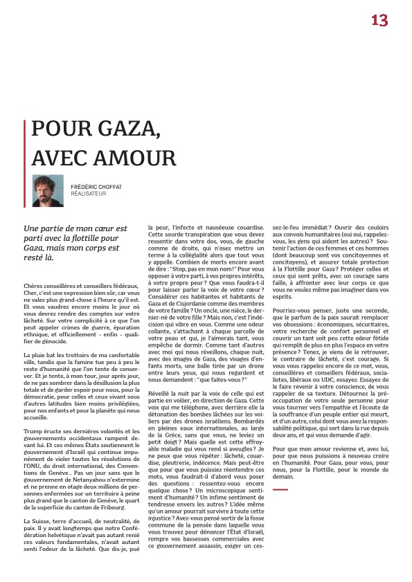 Invité par le journal Causes communes à me positionner sur Gaza, je propose une lettre adressée au Conseillers Fédéraux, en soutien à la Flottille.